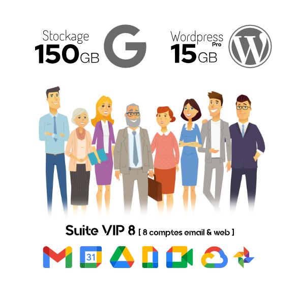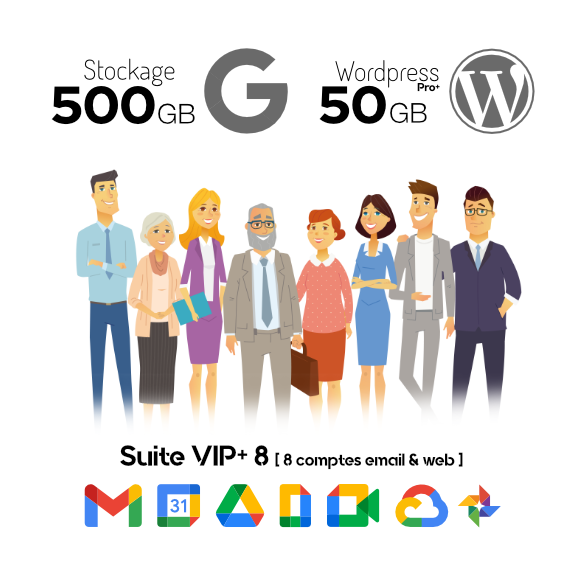 • Huit comptes Google Workspace incluant  quatre emails personalisés @tessier.fr sur la plateforme Gmail. Stockages (15Gb, 30Gb, 150Gb ou 500Gb)